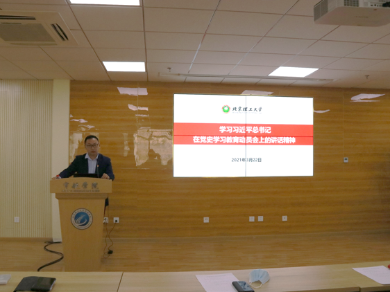 党委书记龙腾领学了习近平总书记在党史学习教育动员大会上的重要讲话精神,传达了《中共北京理工大学委员会关于开展党史学习教育的实施方案》,介绍了《宇航学院开展党史学习教育实施方案》,并对学院开展党史学习教育提出要求:一是提高政治站位。我们党的一百年,是矢志践行初心使命的一百年,是筚路蓝缕奠基立业的一百年,是创造辉煌开辟未来的一百年。全体党员深刻认识开展党史学习教育的重大意义,深刻领会党史学习教育为何学、学什么、怎么学;二是压紧压实责任。成立学院党史学习教育领导小组,统筹谋划推进,将党史学习教育与“十四五”科学规划相结合,与推动学院事业高质量发展相结合,强化责任担当意识,营造追求卓越的干事氛围。班子成员要严格履行“一岗双责”,落实意识形态工作责任制,树立正确党史观,依托学院综合改革为师生员工办实事。三是突出学院特色,各党支部要按照学院实施方案,将学科史、航天精神融入党史学习教育,用好“红色基因”专题书柜,完善宇航楼文化建设,把党史学习教育成效转化为推动学院发展的生动实践。