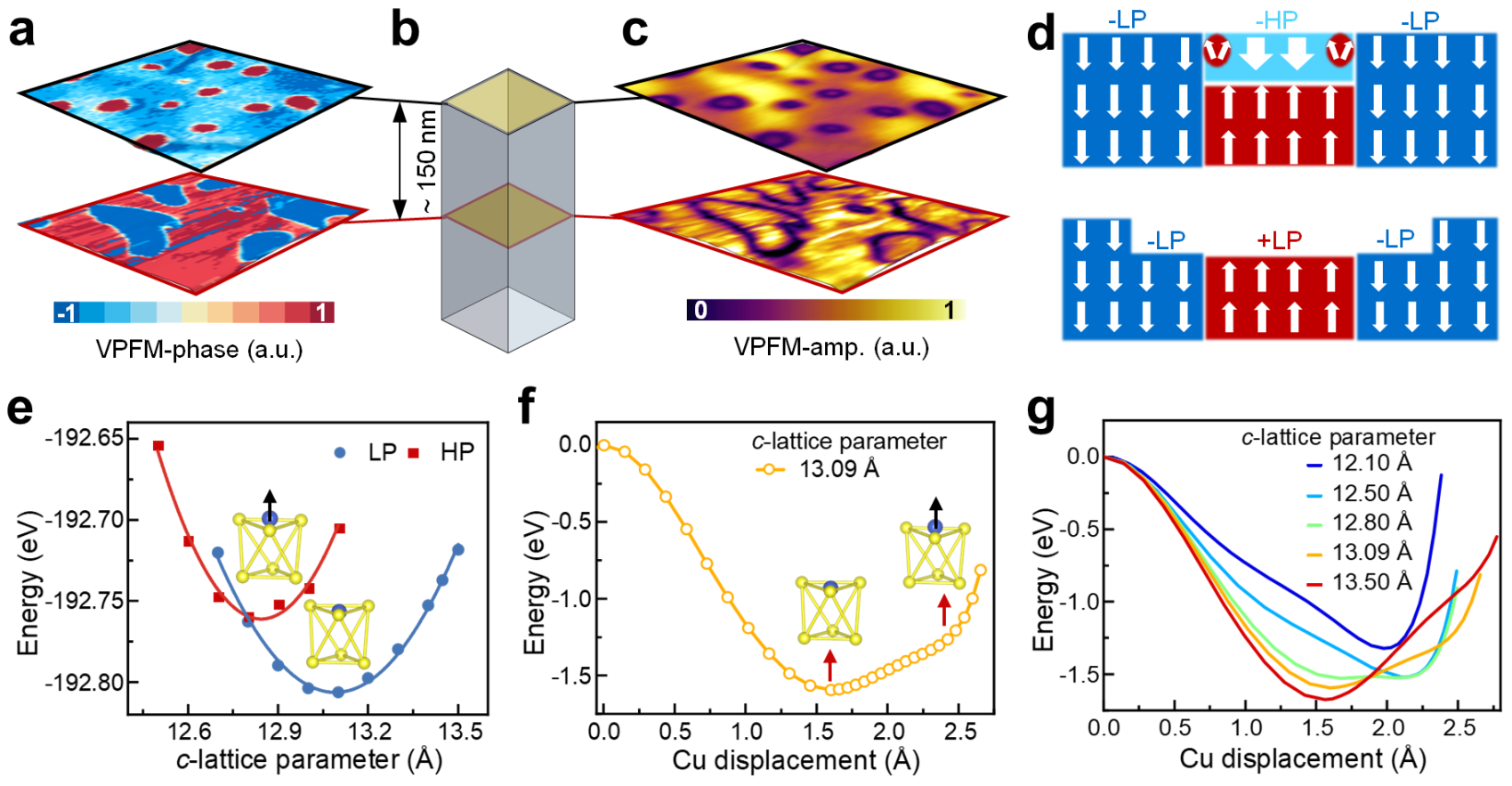 1.压缩应变促使Cu离子迁移至范德华隙,实现由LP到HP相的转变;而应变梯度则通过挠曲电效应产生强局域电场(可达106 V/cm),共同驱动迷宫畴向气泡畴演变。